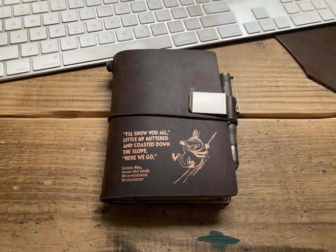 日記用は今も無地。家計簿をスケジュールに移動したので、今は純粋に日記だけ。だいたい3ヶ月分が収まるようにレイアウトも固定。カードホルダーを引っ越してきたのが以前と違う点。日記用はリフィルが1冊なので下敷きがわりの厚みとして活躍。トラベラーズノートオリジナルの下敷きも併用。なるべくその時期の傷跡を残すため、表紙にその時出会ったシールなんかを貼るようにしてる。3ヶ月なのであまり増えないけど。